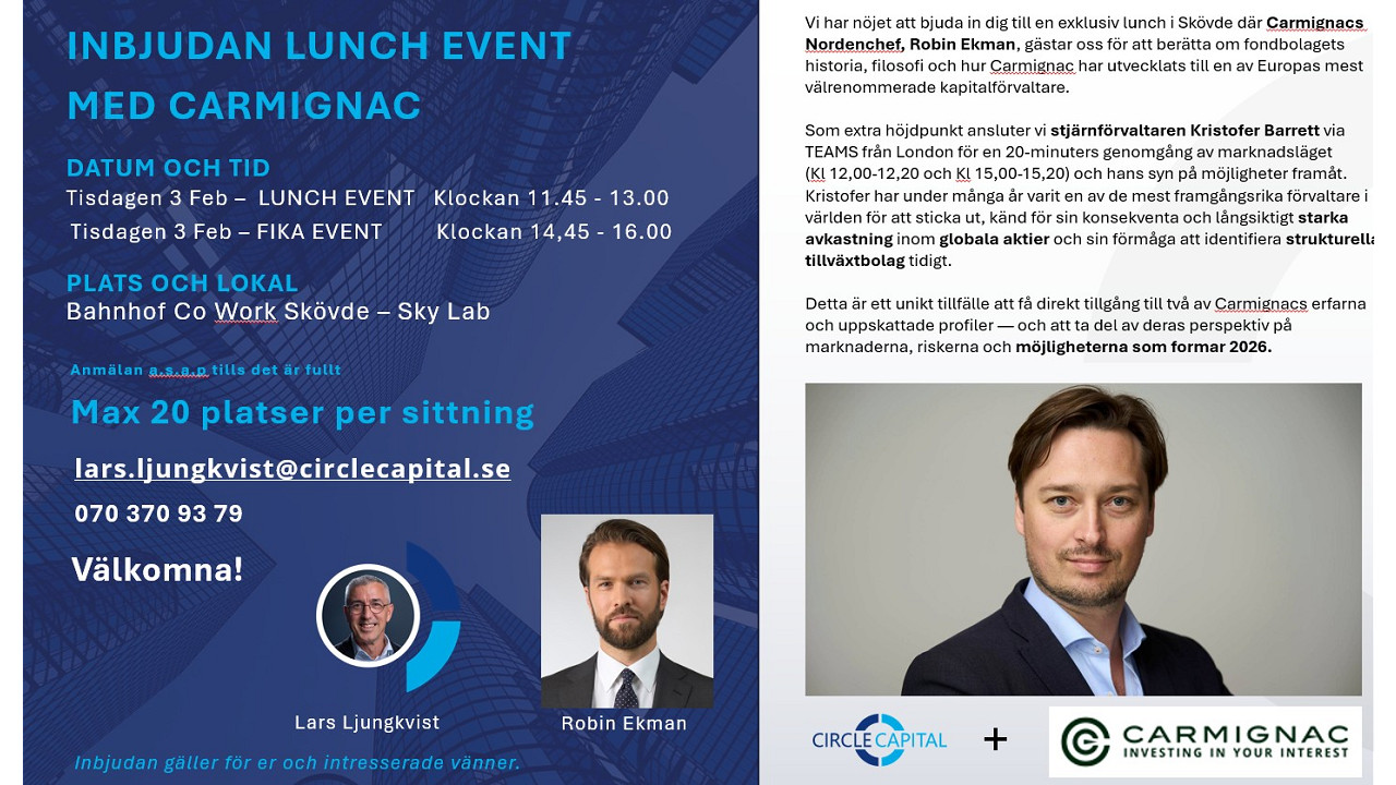 Det ska bli spännande och få höra vad stjärnförvaltaren Kristofer Barrett har att säga just nu om hur bolagen i Carmignac fonderna presterar och att få lyssna på Nordeachefen för Carmignoc fonder Robin Ekman som berättar mer om historien bakom fondbolaget.